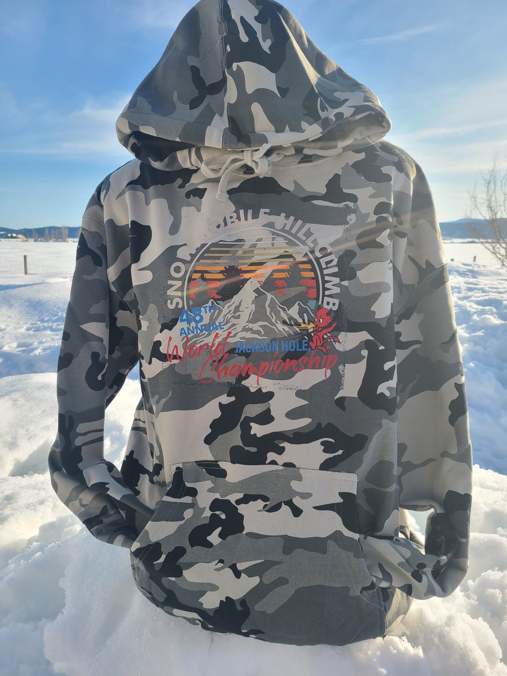 The JH World Championship Snow Camo Hoodie boasts a unique design with distressed retro sunset mountain race design, perfect for fans of the 48th annual Jackson Hole Hillclimb Snowmobile race. Stay warm and stylish with this 10 oz snow camo hoodie.